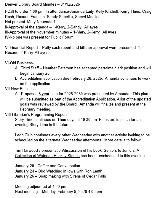 Minutes January 2026 Board Meeting Minutes February 2026 Board Meeting Minutes December 2025 Board Meeting Minutes October 2025 Board Meeting Minutes November 2025 Board Meeting Minutes